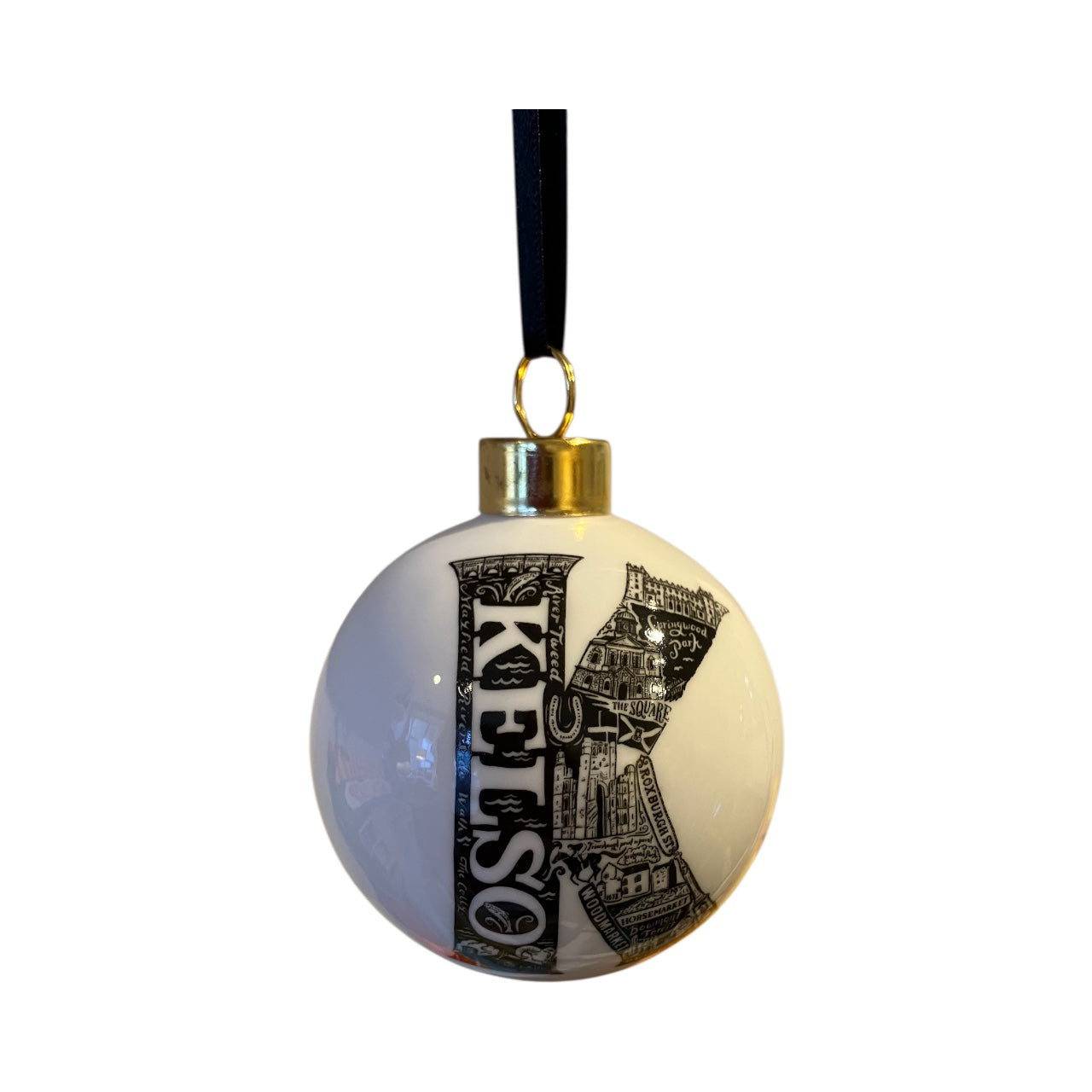The ceramic bauble has the K printed on back and front with a gold finial and a black velvet ribbon for hanging.