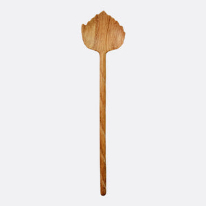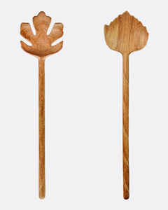A pair of charming hand carved wooden salad servers with leaf design, perfect for salads, rice and pasta dishes.