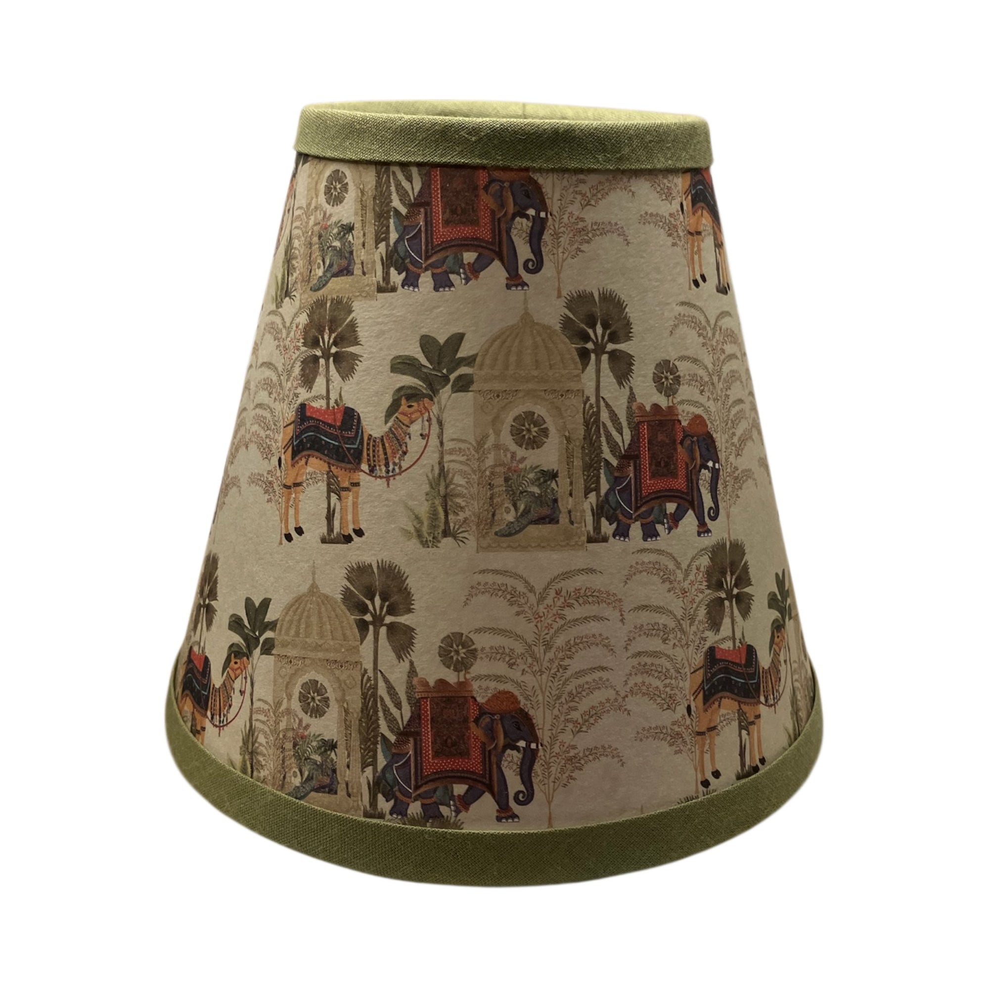 A charming clip-on paper lampshade with trim, depicting camels and elephants.