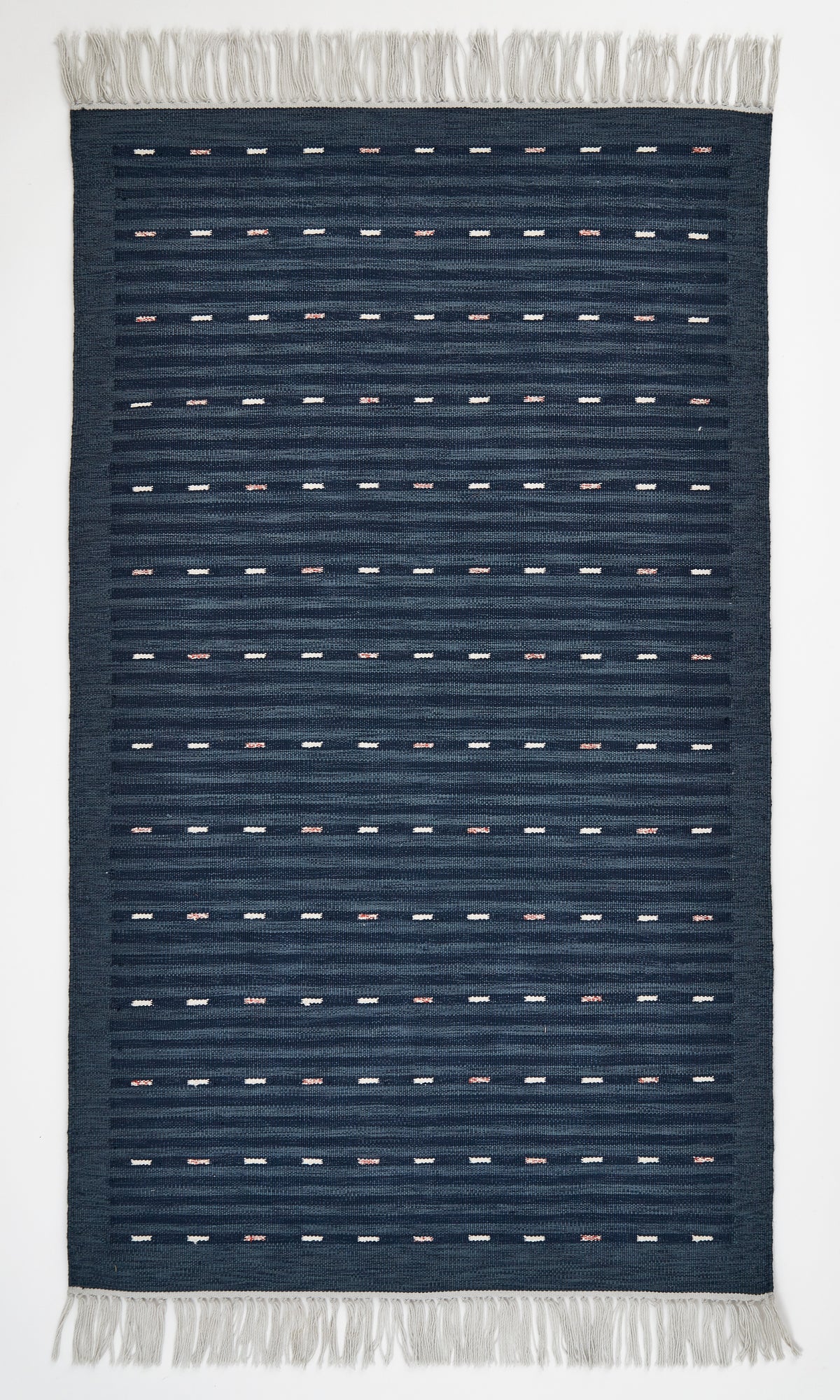 These classic Cosmo Indigo Rugs feature a bohemian striped design in faded indigo blue. Hand-loomed with a fine kilim weave, these gorgeous rugs are especially hard-wearing and can be used in all rooms, both indoors and outdoors.